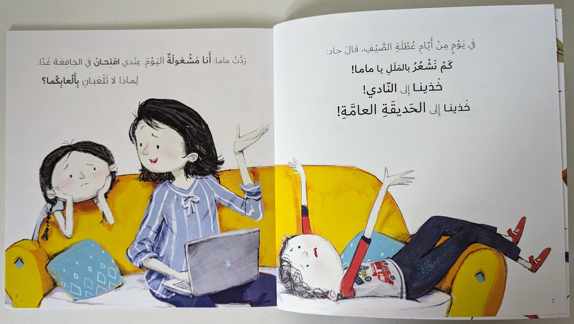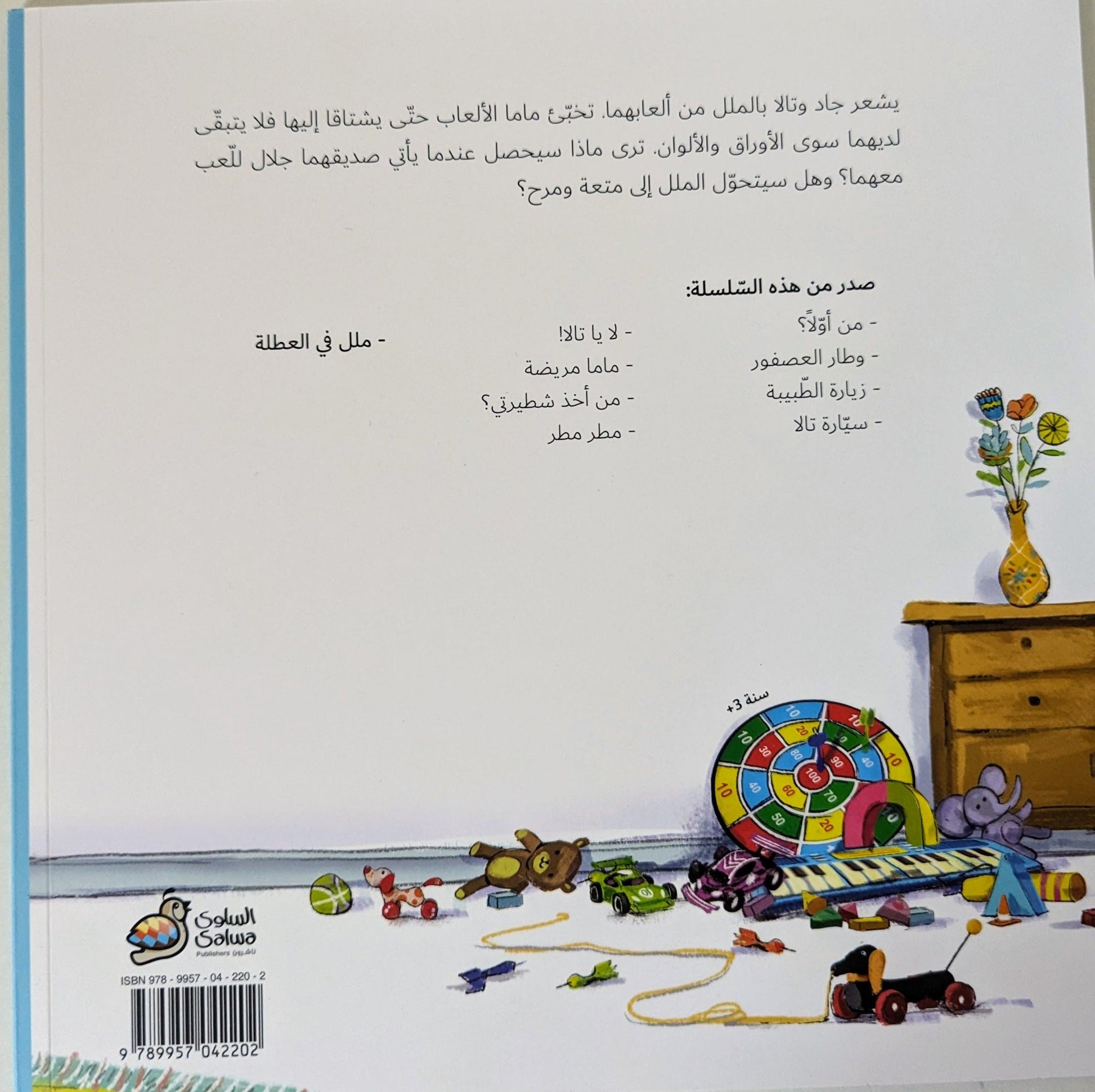 Jad and Tala are bored and don’t know what to do. When their mother suggests they play with their toys they refuse to say their toys are old and they are bored of them. To their horror, their mother confiscates their toys and now they only have papers and colours available to share with their friend Jalal when he visits. Will they be able to have fun with only papers and colours to play with?