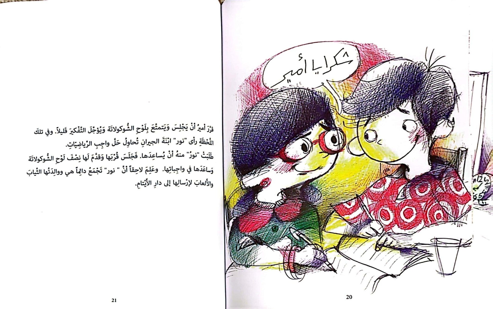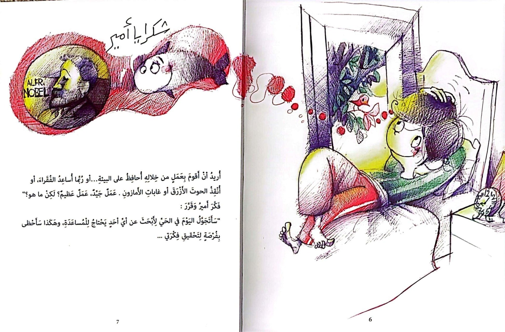 Amr spends his busy day thinking about how he can do a good deed that gives him a sense of self-satisfaction, and more importantly, one that deserves a Nobel Prize. Amr wanders through the streets of the neighborhood, offering help to many around him, like assisting his neighbor Um Amin in carrying heavy grocery bags, watering plants with Abi Samer, and helping his friend Khaled fix his bike after falling off. Amr gradually discovers that no matter how simple the act is, it can make a big difference to others. Good deeds lie in their value, not their size.