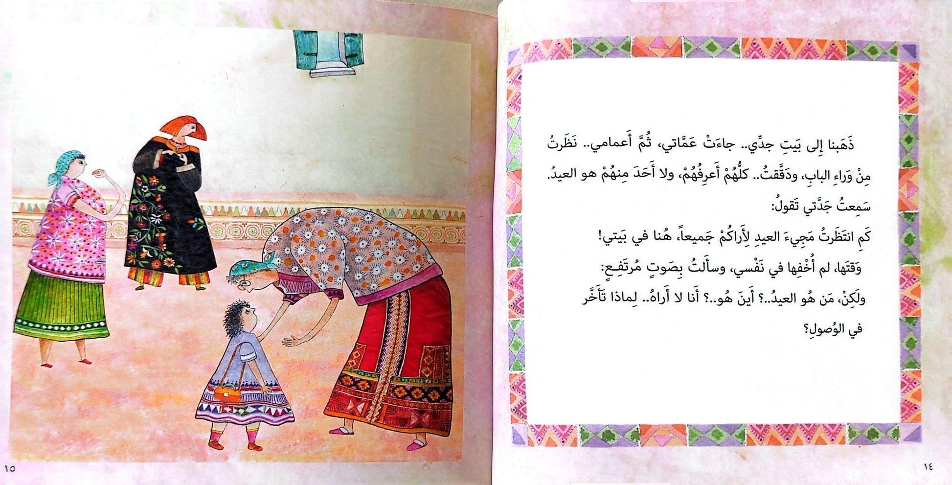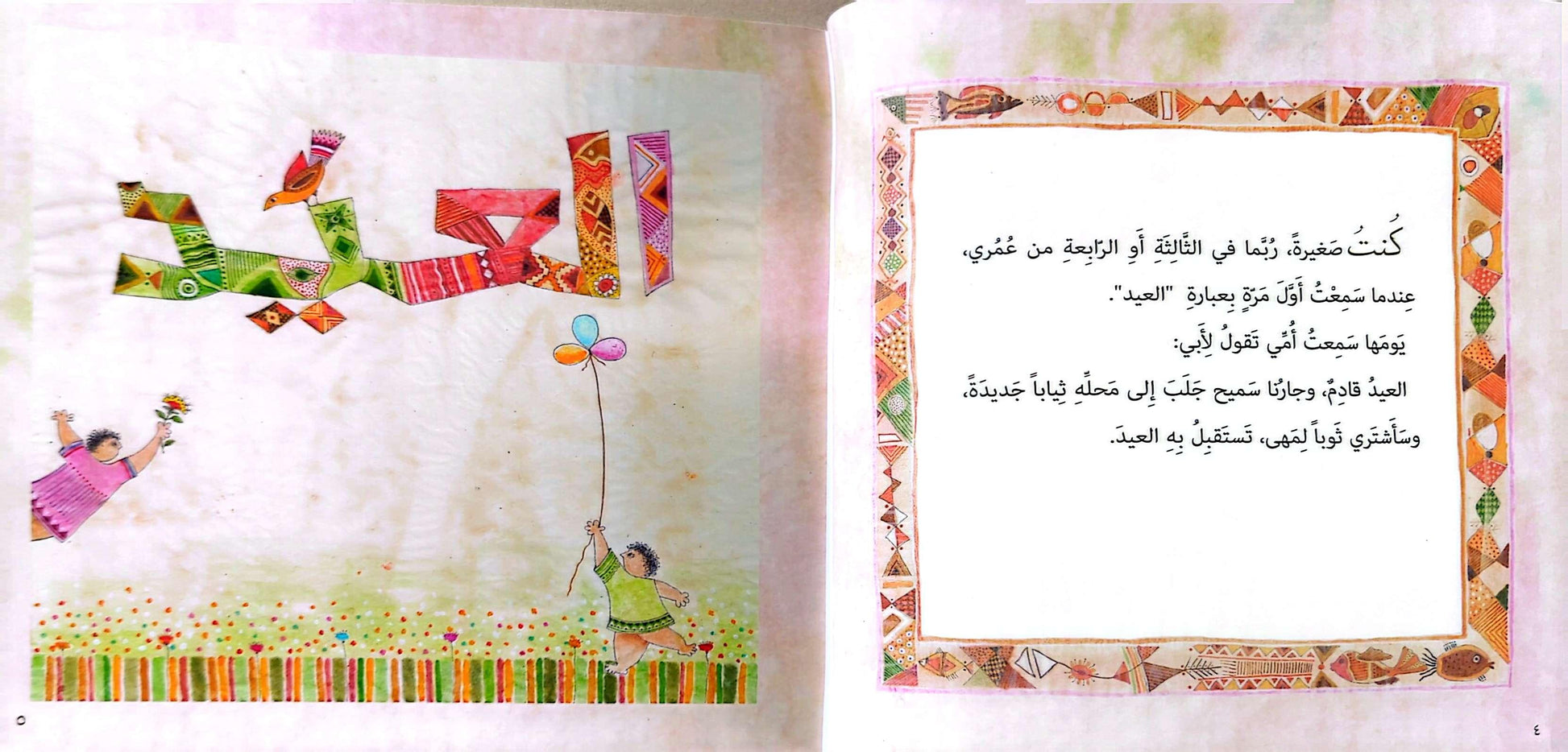 A book that deals with children’s free imagination and their spontaneous questions but woven by the beautiful aspects of Eid: the smell of cakes, Eid clothes, Eid gifts, and swings.